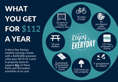 The West Des Moines Parks and Recreation Department oversees 1,303 acres of parkland consisting of parks, special use facilities, a natural resource area, greenways, and 65 miles of paved multi-purpose trails. The department provides a wide variety of recreational services including operating a full-service community center, softball complex, two outdoor aquatic centers, spray grounds, nature lodge, dog park, archery facility, amphitheater, boathouse, and recreation complex.